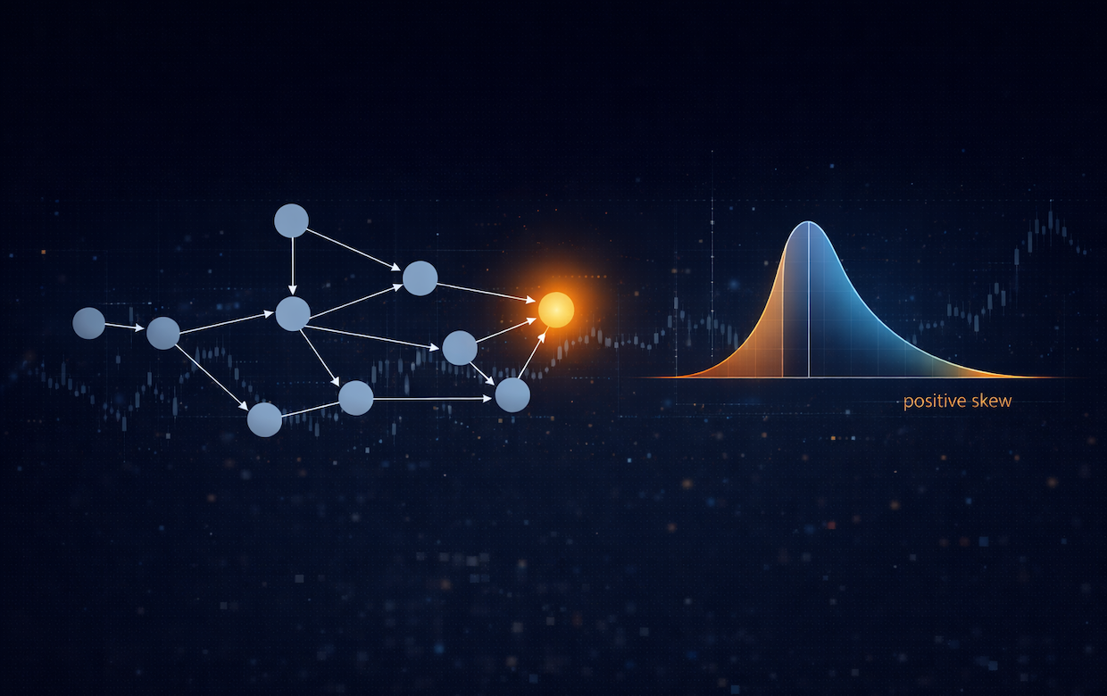 A particularly important metric in Eventology is skewness, which measures asymmetry in probability distributions. Skewness is a statistical measure used in financial markets to capture the degree of price movement bias. It quantifies how much a distribution deviates from normal distribution (a symmetrical bell curve). Positive skewness indicates a distribution with a tail to the right (extreme upward movements), while negative skewness indicates a tail to the left (extreme downward movements).